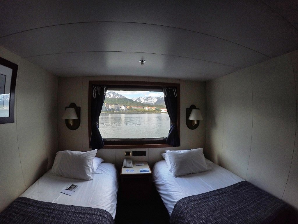 Luego del check in, pueden pasar a sus camarotes a dejar sus cosas. En el caso del Australis todos los camarotes tienen las mismas dimensiones, y cuentan con baño privado, placard y cajones donde dejar sus cosas. Antes de zarpar los invitarán a uno de los salones de la parte superior, donde hay una recepción antes de que el barco deje el puerto de Ushuaia. Si quieren probar algún trago nuevo pueden animarse con un Calafate Sour. En el tercer piso tienen un salón con vistas panorámicas, y el cuarto nivel encontrarán el bar, que realmente es un espacio muy bonito, en madera y con una gran barra. Para quienes viajan en el crucero todas las bebidas están incluidas. El bar está abierto hasta la medianoche.