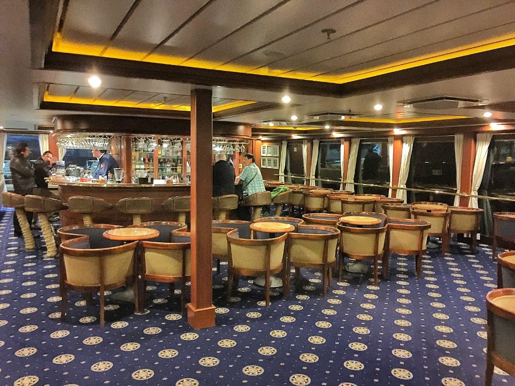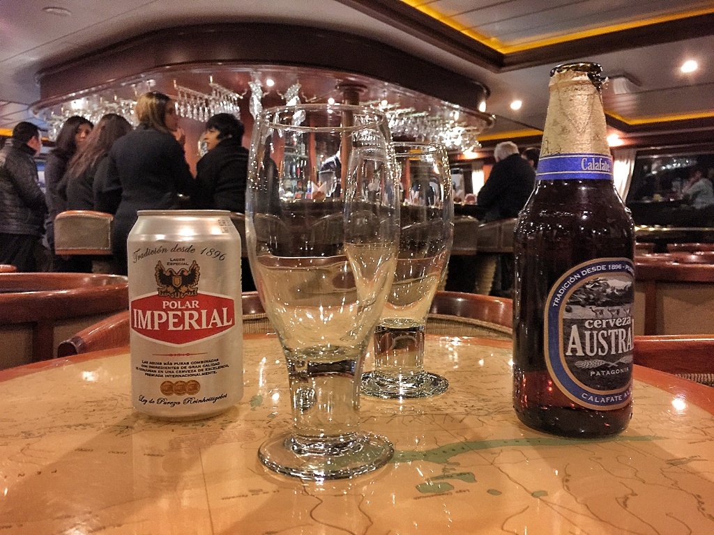 Para los interesados en el tema, el consumo de bebidas alcohólicas está incluido con el pasaje. El bar, que realmente es muy lindo, está abierto hasta las 12 de la noche. Hay cervezas, en particular la Austral de Punta Arenas, más vinos y cócteles. Excelente lugar donde ir a charlar antes o después de la cena. Hay karaoke la segunda noche del viaje. La tercera y última noche se organiza una subasta de la carta de navegación, y hay un discurso despedida del capitán.