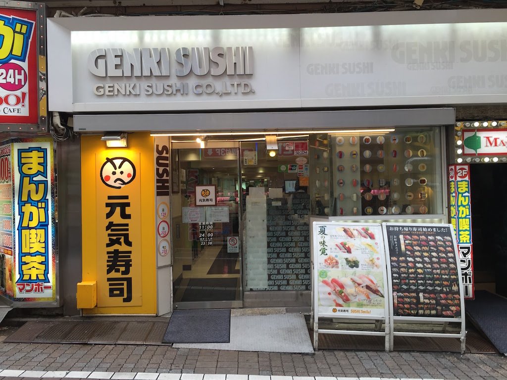 Y aquí vemos como llega la comida en Genki Sushi, a través de un sistema de rieles en la pared. Cuando retiramos el plato con la comida, regresa a la cocina. El sushi es bastante básico -si quieren probar mejores, siempre está la opción de ir a lugares cerca del mercado de Tsukiji- pero el precio es bastante económico. Y cómo pide de a pocas piezas, perfectamente pueden gastar bastante poco. Pero un cálculo de 800 a 1000 yenes por persona es muy razonable. Al igual que Nakau, hay jarras con té verde y agua fría al lado de cada puesto.