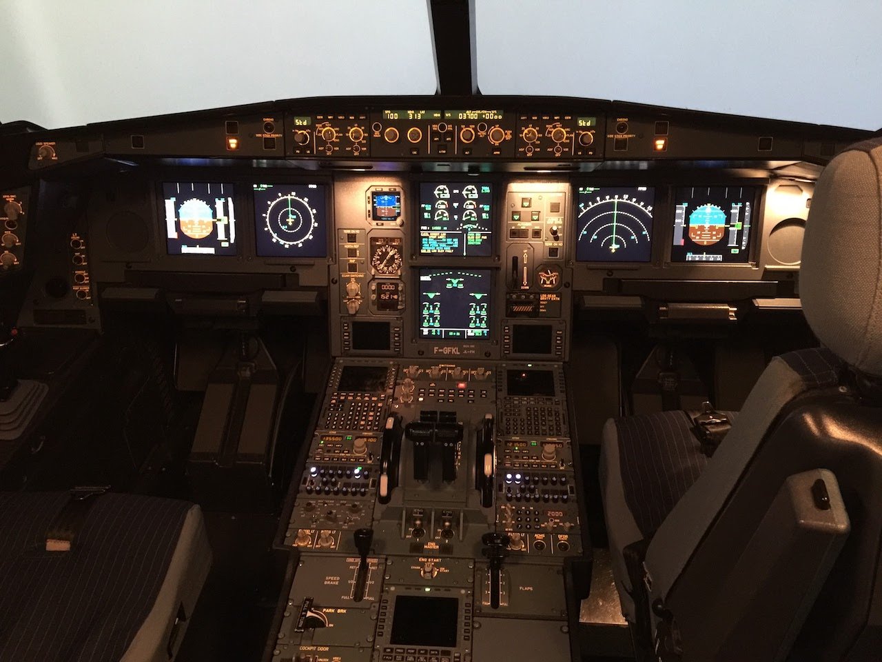 Pudimos ingresar a los simuladores para los tres tipos de aviones de la flota. En ellos se reproduce por completo el interior de la cabina, y podemos operar el avión como si estuviéramos volando. Se puede ver el video del recorrido, hacer maniobras, aterrizar y despegar, y volar con todo tipo de condiciones meteorológicas.