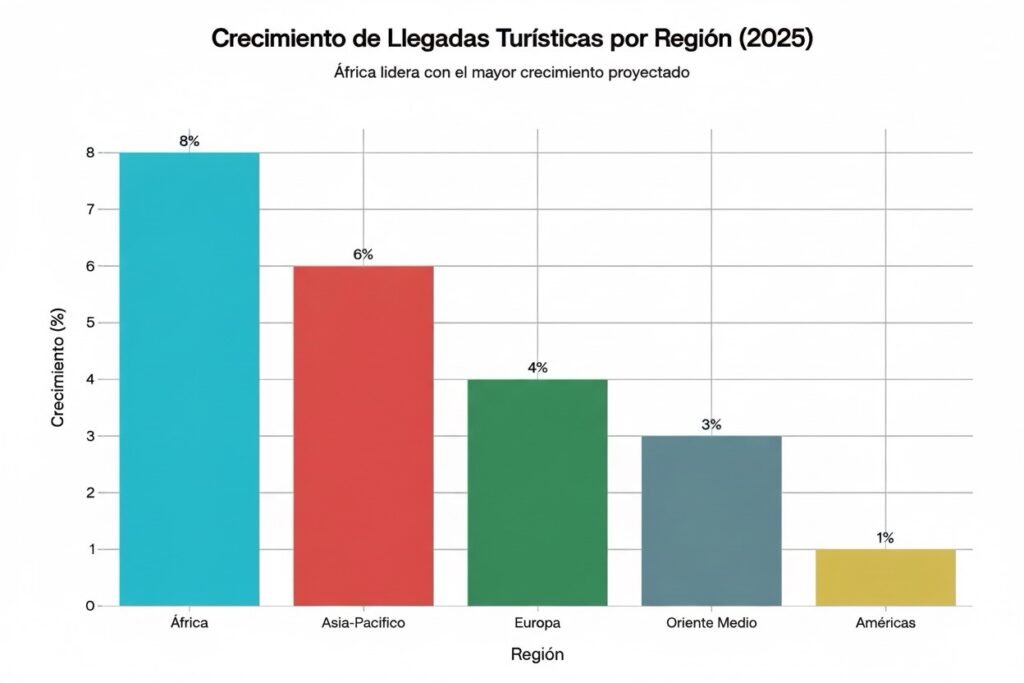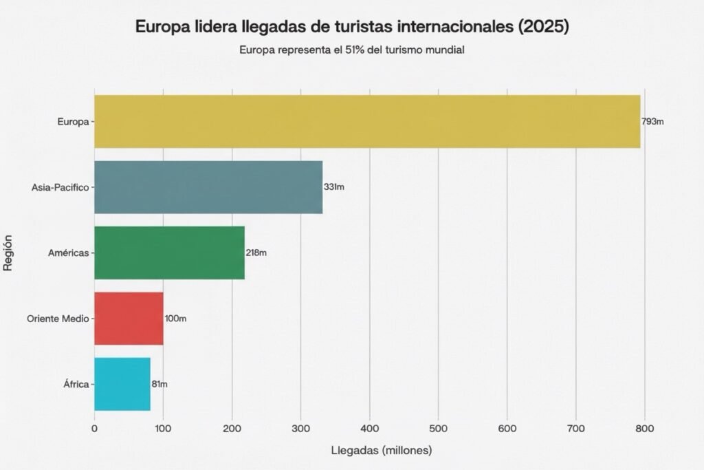 La geografía del turismo en 2025 refleja dinámicas de poder persistentes. Europa sigue siendo el destino dominante con 793 millones de llegadas -más de la mitad del volumen global-, con un crecimiento del 4 por ciento respecto a 2024 y un 6 por ciento por encima de los niveles pre-pandemia de 2019. Aunque la recuperación europea no es uniforme: mientras Europa Occidental creció 5 por ciento, Europa Central y Oriental rebotaron un 6 por ciento pero permanecen 9 por ciento por debajo de los niveles pre pandemia.