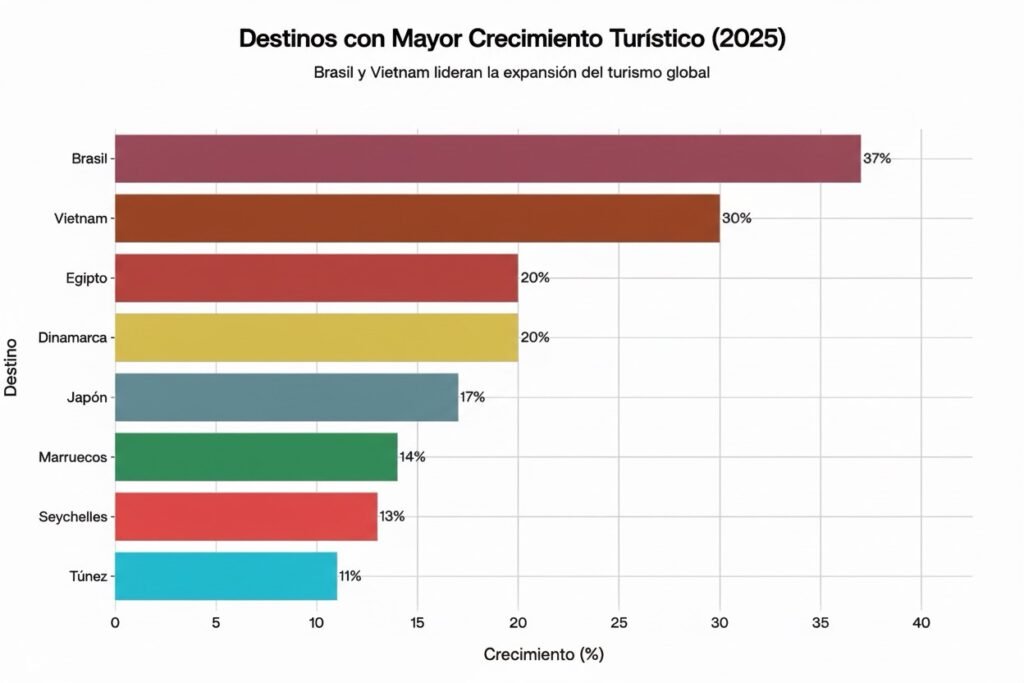 Asia-Pacífico, por su parte, emerge como la región de mayor dinamismo. Con 331 millones de llegadas y 6 por ciento de crecimiento, la región alcanzó 91 por ciento de los niveles pre pandemia, aunque la concentración geográfica sigue siendo notoria. La región Pacífico lideró con 13 por ciento de crecimiento, impulsado especialmente por Japón (+17%), Vietnam (+30%) y China. Vietnam se perfiló como el país de mayor crecimiento, con un 34 por ciento sobre 2019, y se posicionó entre los seis países con mayor incremento turístico globalmente.